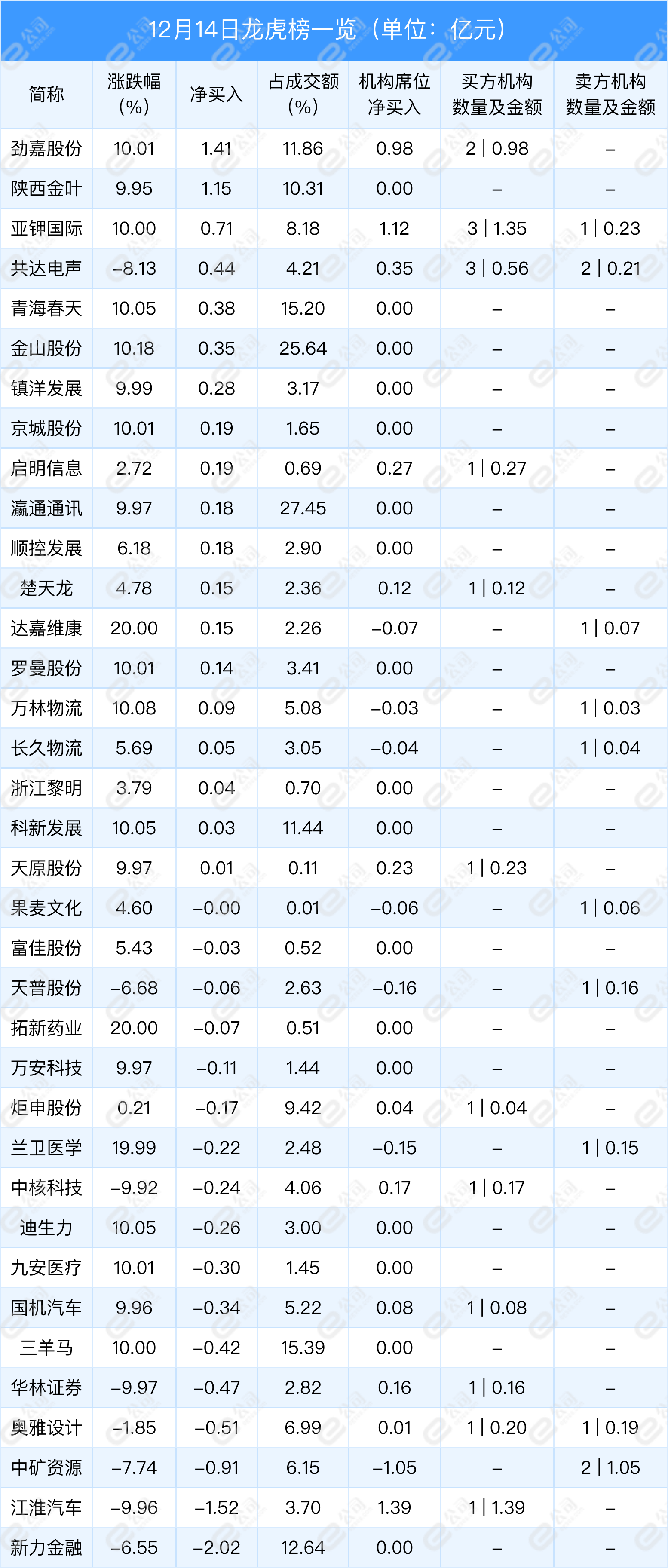12月14日龙虎榜中机构及营业部席位资金净卖出1.54亿元,其中净买入的个股有19只;净卖出的个股有17只。净买入金额居前的个股分别是劲嘉股份、陕西金叶、亚钾国际等,净买入金额占当日成交额比例达11.86%、10.31%、8.18%。