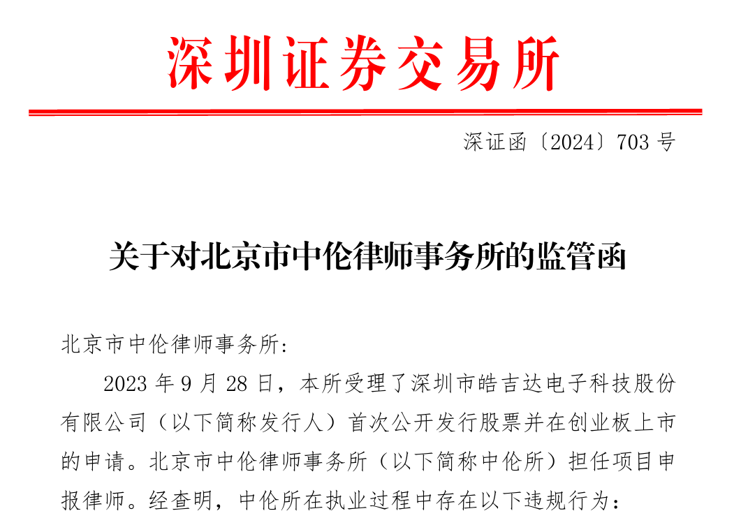 在“申报即担责”的环境下,虽然皓吉达撤回申报,但对于项目中存在的问题,中介机构仍然难辞其咎。除中信证券外,深交所11月8日还下发了对中伦律师事务所(简称”中伦所“)采取书面警示的监管函。