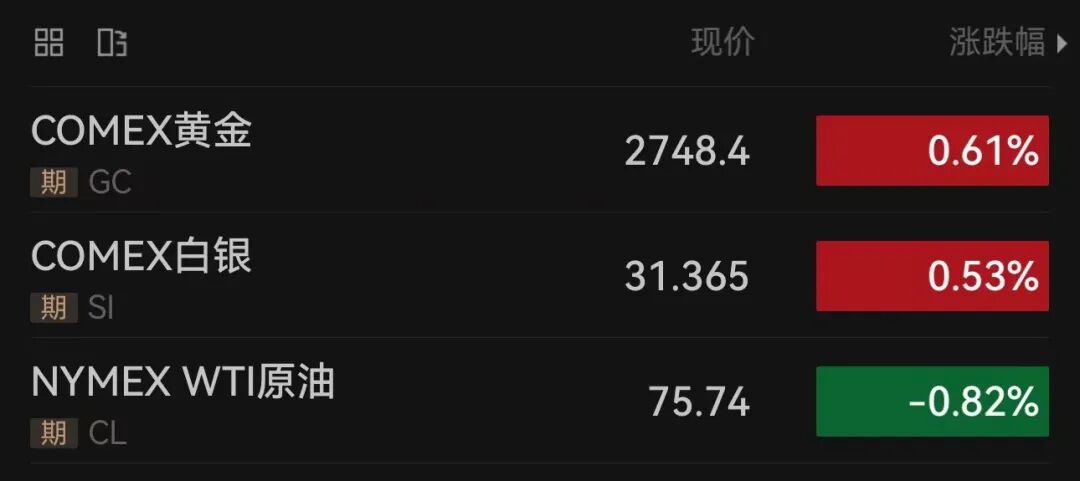 黄金白银上涨。COMEX期金一度向上触及2750美元/盎司。