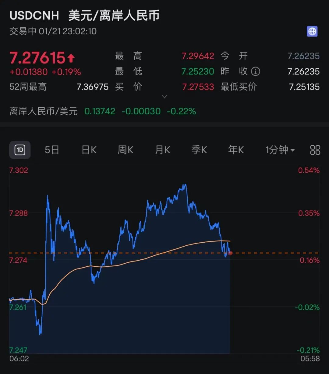 受美元指数大幅回落影响,境内外人民币汇率巨震。截至发稿,美元兑离岸人民币报7.27615。