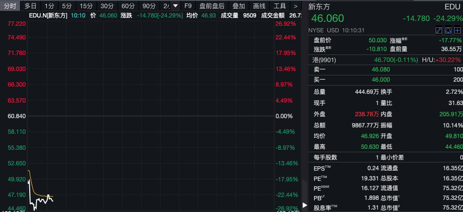 新东方美股跌逾24%。