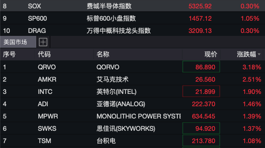 大型科技股多数上涨,特斯拉、谷歌涨超1%,苹果跌逾2%。芯片股普涨,英特尔、台积电涨超1%。