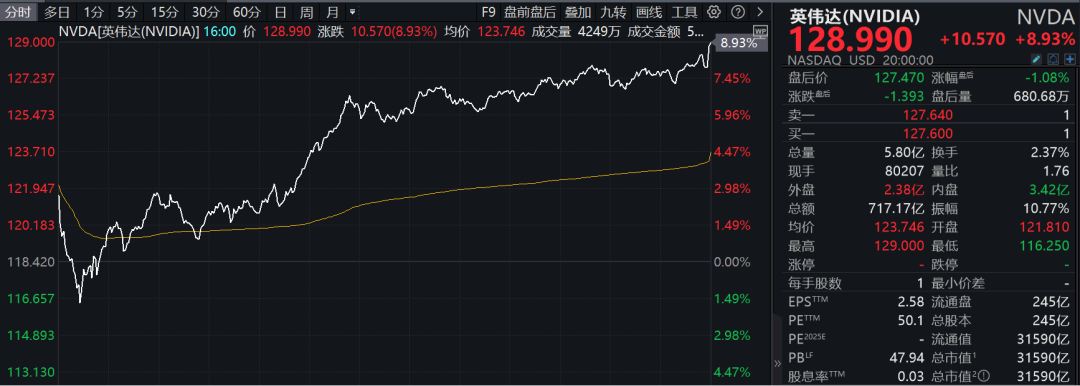 大型科技股强势反弹,英伟达大涨近9%,苹果涨超3%,微软、Meta涨超2%,谷歌、亚马逊涨超1%,特斯拉小幅上涨。