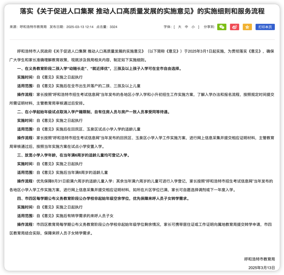 昨天,呼和浩特三孩补贴10万元的消息引发热议。今天,该地发布了新政策,继续加码配套措施——三孩及以上孩子入学可在全市自由选择学校。