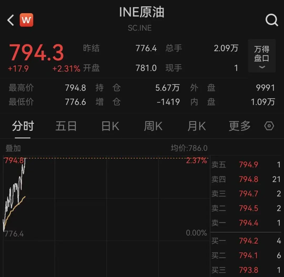 原油则继续拉涨。国内原油期货主力合约最新报794.3元/桶,涨幅扩大至2.31%。