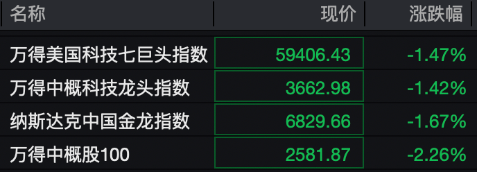 科技股普跌,万得美国科技七巨头指数跌超1%,特斯拉、脸书跌超2%。中概股也多数下跌,纳斯达克中国金龙指数下跌1.67%。金山云跌超9%,小鹏汽车跌超6%。
