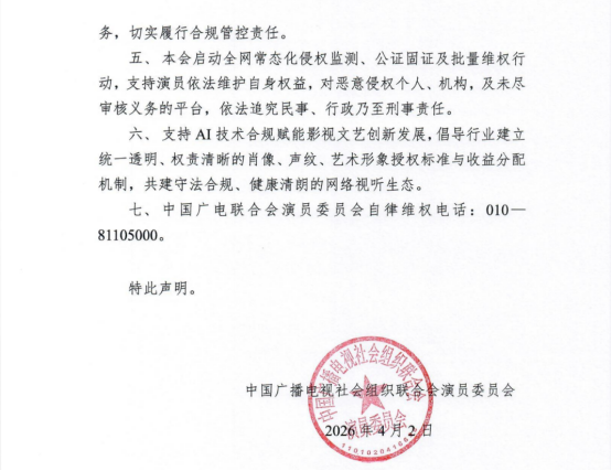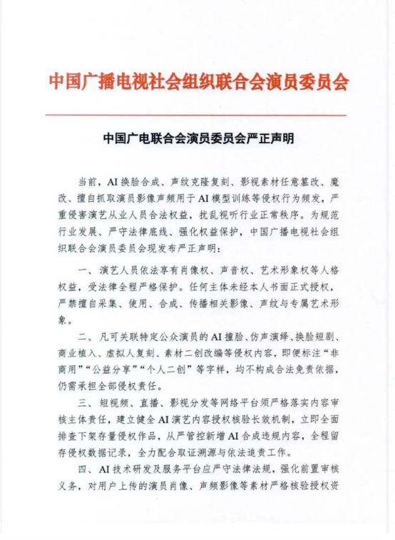 中广联演员委员会声明提出,任何主体未经演艺人员本人书面正式授权,严禁擅自采集、使用、合成、传播相关演艺人员影像、声纹及专属艺术形象。
