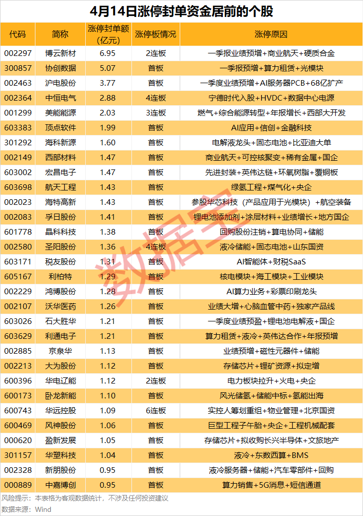 从连续涨停天数看,华远控股、*ST原尚等已连收6个涨停板,连续涨停板数量最多。以封单金额计算,博云新材、协创数据、沪电股份等涨停板封单资金居前,分别有6.95亿元、5.07亿元、3.77亿元,三股均为一季报预增股。