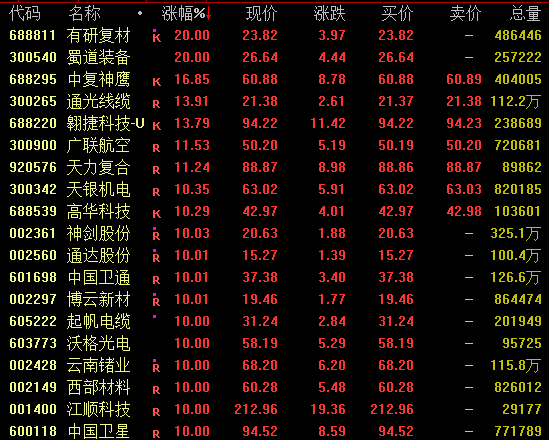 商业航天概念盘中走势活跃,截至收盘,有研复材、蜀道装备20%涨停,中复神鹰大涨近17%,神剑股份、中国卫通、中国卫星等均涨停。