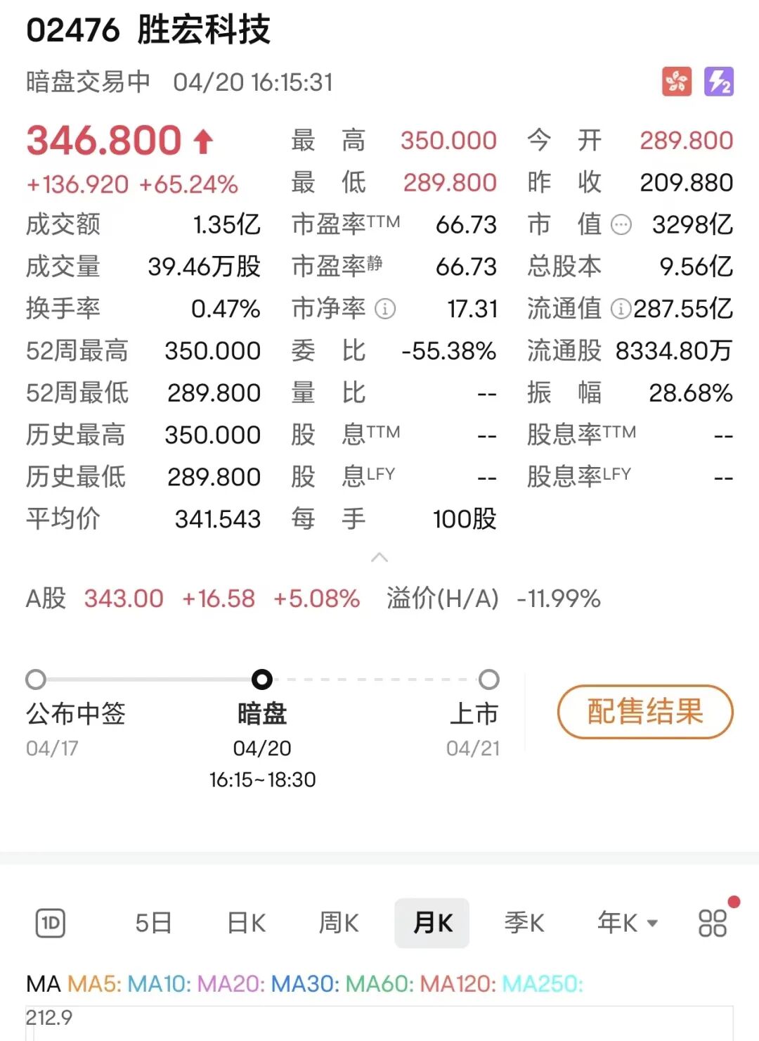 胜宏科技(02476.HK)今日暗盘交易,开盘价为289.8港元/股,之后持续走高,每股一度上涨到350港元。截至发稿,交易价为346.8港元/股,上涨65.24%。